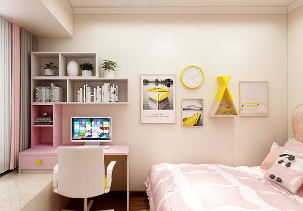 ▲小朋友的房間比較明亮,童趣十足,水天藍和公主粉的設計再搭配明亮黃,瞬間輕快明亮,功課區(qū)和休閑區(qū)的設計,書桌功課做完立馬可以在休閑區(qū)玩耍,一房多用,小朋友們表示很喜歡自己的房間。