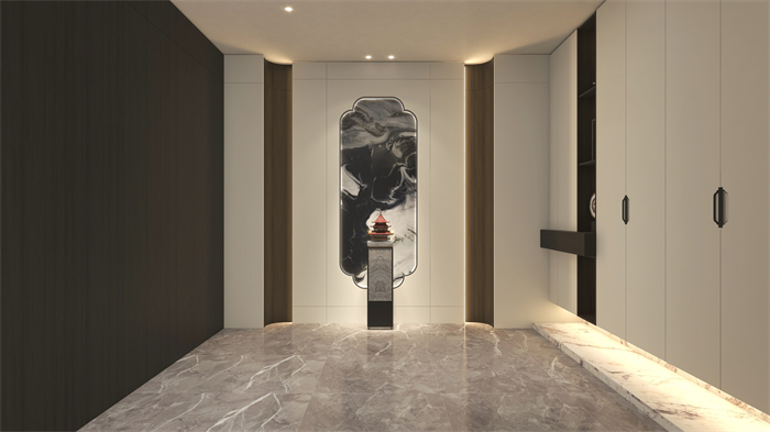 門廳:新中式元素“奢石”地臺作為點綴,開啟新國潮視覺盛宴。護墻板燈帶勾勒出簡約的宮燈形狀,與右邊柜門的燈籠造型拉手遙相呼應。對稱式圓弧轉(zhuǎn)角,將護墻板與玄關柜柔美連接,渾然一體,自然天成。