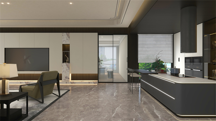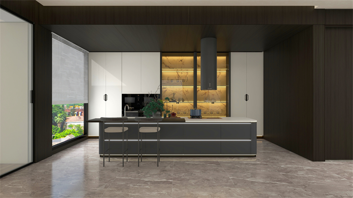 廚房:廚房結(jié)合現(xiàn)代生活需求,以小吧臺+開放西廚的形式呈現(xiàn),一字形島臺延伸出洗切煮及餐桌多重功能,散發(fā)著清透高級的雅致;櫥柜+餐酒柜合二為一,琳瑯滿目的酒水、餐具陳列于金屬玻璃柜中,給人以唾手可得的滿足感。