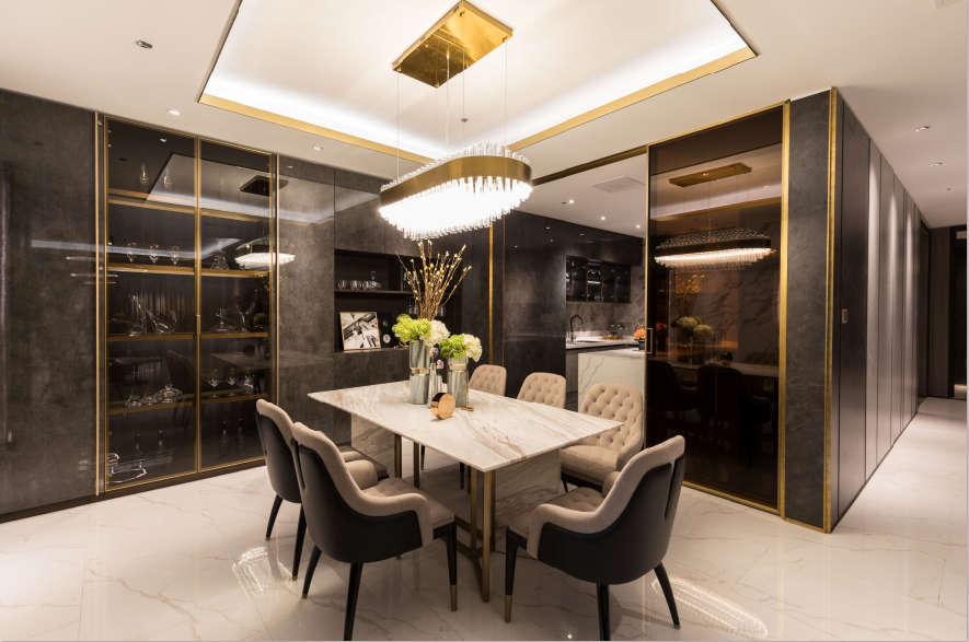 廚房和餐廳一體化設(shè)計(jì),高亮光門板一板到頂,空間更顯大氣,黃銅金屬線條的點(diǎn)綴,讓就餐多了一份奢麗。餐廳緊挨著廚房,拿取美食也較為方便。歐式靠背的椅子更有著獨(dú)特的人文韻味,輕奢格調(diào)的設(shè)計(jì),不僅讓就餐多了一份藝術(shù)感和儀式感,還會(huì)讓人心情大好,胃口也會(huì)大開。