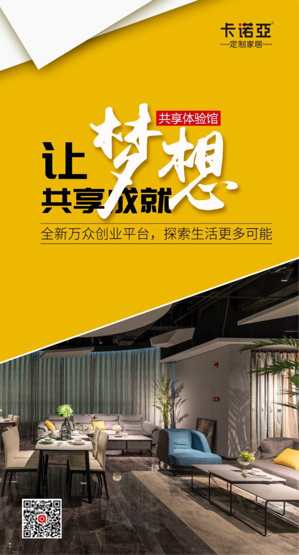 卡諾亞定制家居共享體驗館,由廣東卡諾亞家居有限公司全新打造,全國首家共享體驗館坐落于廣州天河區(qū)車陂路95號2樓,屬于中國泛家居行業(yè)創(chuàng)新孵化空間,面向家居建材、裝飾設(shè)計、裝修公司、軟裝公司、店長、導(dǎo)購、獨立設(shè)計師、項目工長、泛家居創(chuàng)業(yè)團隊、大學(xué)生等領(lǐng)域的創(chuàng)新群體、商貿(mào)市場、財稅金融等相關(guān)服務(wù)供應(yīng)商免費開放,提供不同類型的物業(yè)空間和專業(yè)的培育孵化服務(wù)。另外還有創(chuàng)意辦公空間和創(chuàng)意辦公展廳,旨在打造成多層次的創(chuàng)意孵化平臺。